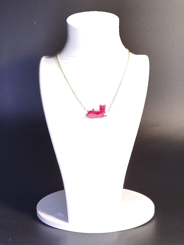 A refined and distinctive creation: this exquisitely crafted necklace features delicate amaranth-toned pearls and a central gemstone shaped like a reclining cat, a symbol of grace and mystery. The 18K gold chain adds a touch of brilliance and prestige, while the adjustable clasp ensures a perfectly elegant fit. A masterpiece of modern femininity and timeless style.