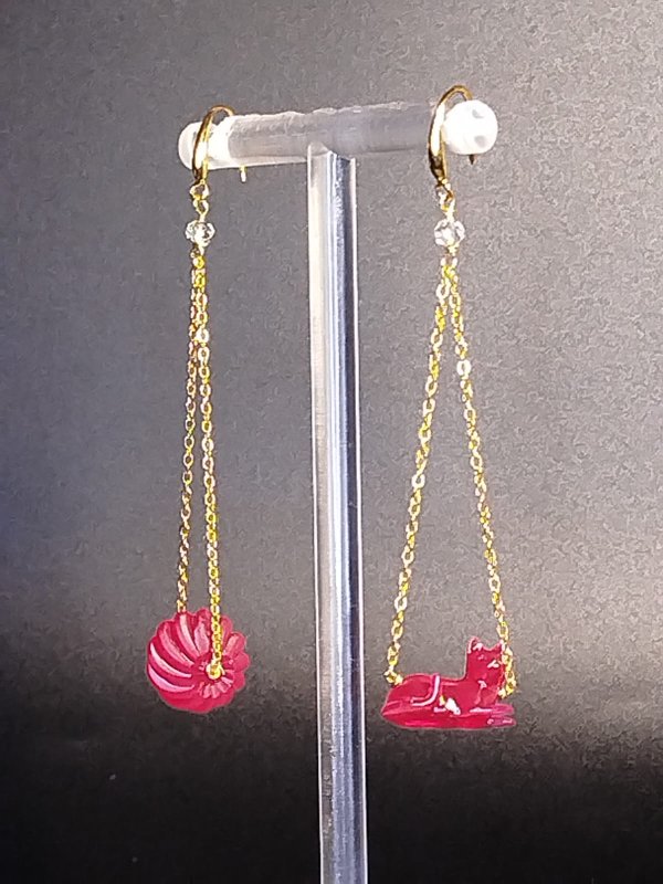 Exquisite drop earrings featuring a graceful cat, gently reclining as if on a swing, gazing at the world, and at its playful companion: a tiny orb that sways delicately from the other earring.
