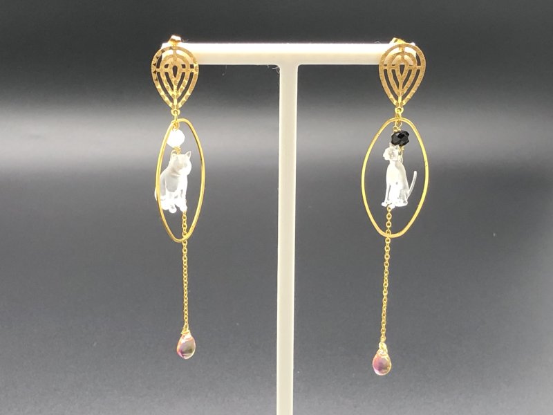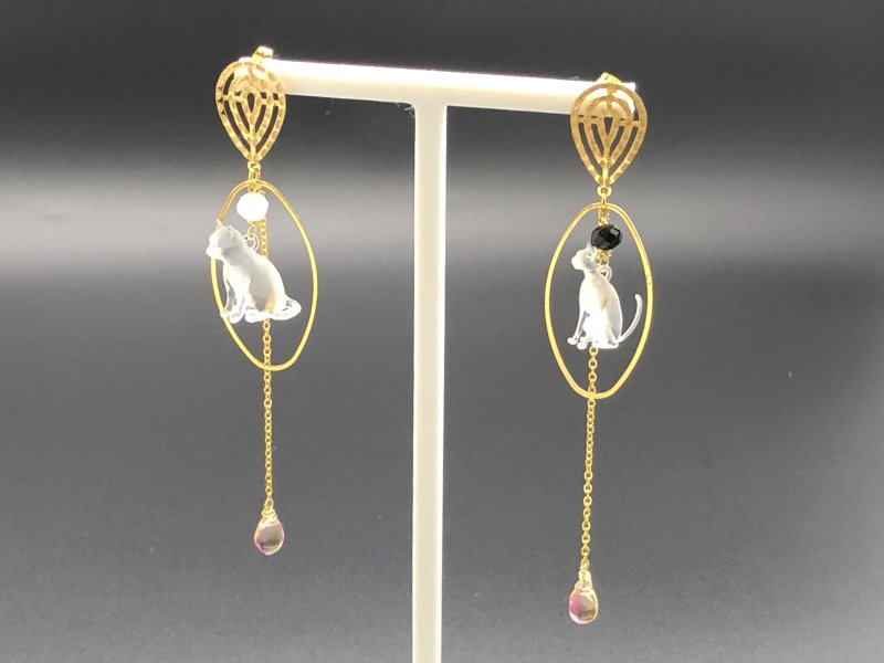 Refined drop earrings featuring diamond-cut cats gracefully framed within golden ovals. The fine chains and iridescent drops create a soft play of light, while the gold detailing adds a touch of timeless sophistication, making these earrings a statement of understated elegance.