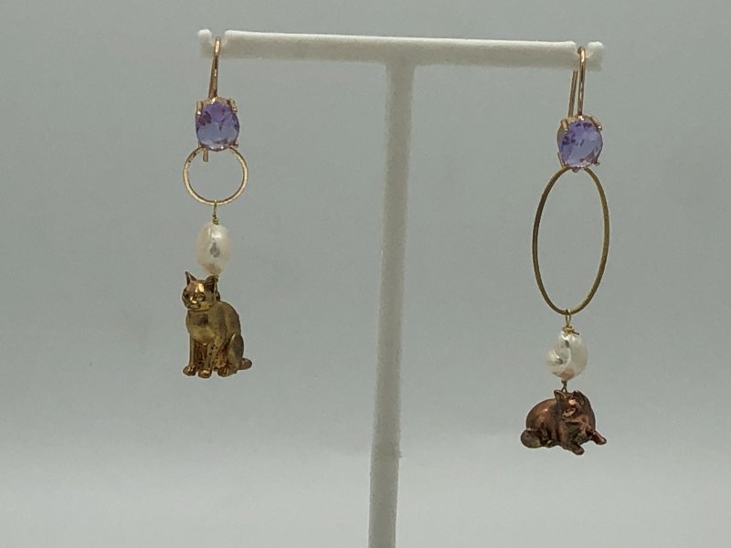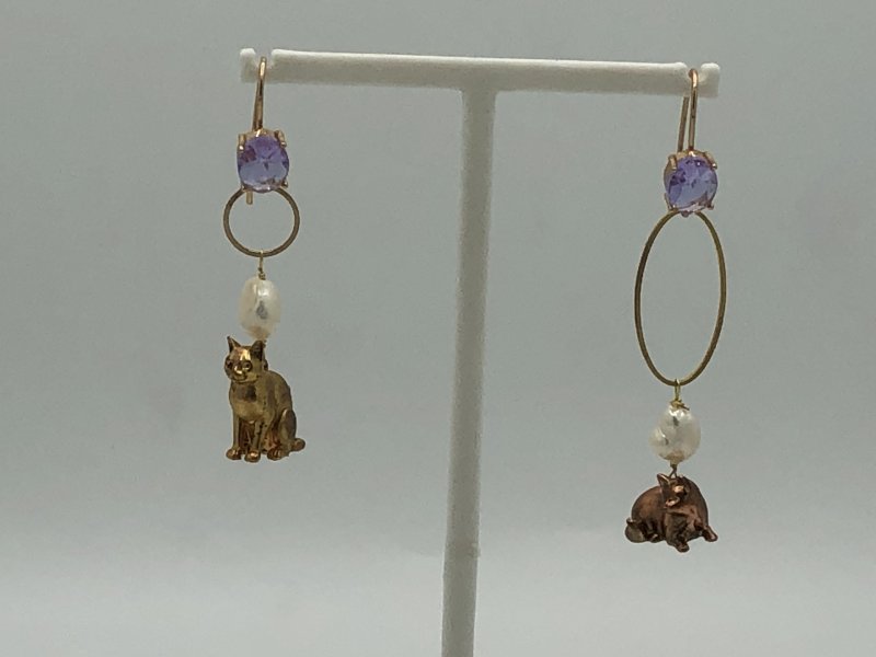 Elegant drop earrings with a finely crafted gold structure and exquisite detailing. The charms depict two cats plated in 18K gold, radiating refined brilliance and timeless charm. A jewel that celebrates feline grace through a perfect balance of sophistication and delicacy.